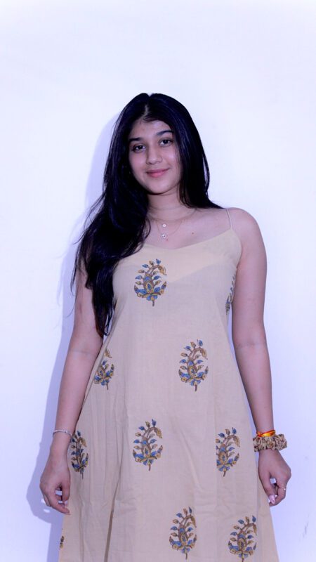 Effortlessly chic, the Ashi Strap Dress in a warm ochre shade features tie-knot straps and a relaxed fit, perfect for those easy, breezy days with its soft handblock print.
