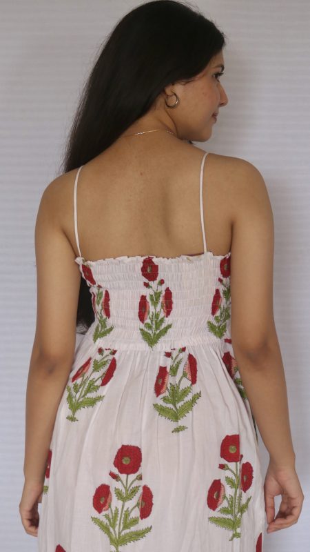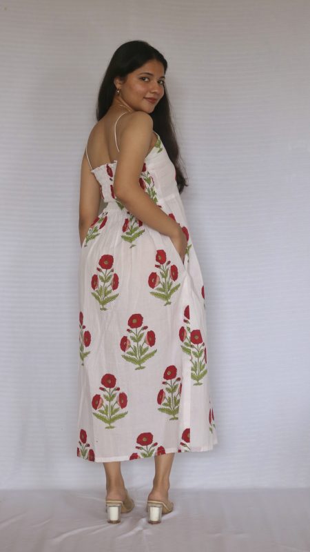 The Gulaab Strap Dress is a delightful blend of style and functionality, featuring fixed straps, a smocked back for added comfort, and handy pockets. Its soft, airy fabric and timeless design make it a go-to choice for effortless elegance on any day.