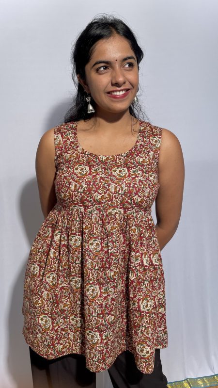 Kalamkari Peplum Top: Embrace the allure of traditional Kalamkari artistry with this exquisite peplum top. Its intricate patterns and modern silhouette create a harmonious blend of cultural elegance and contemporary fashion.