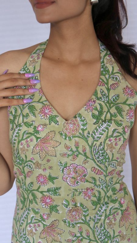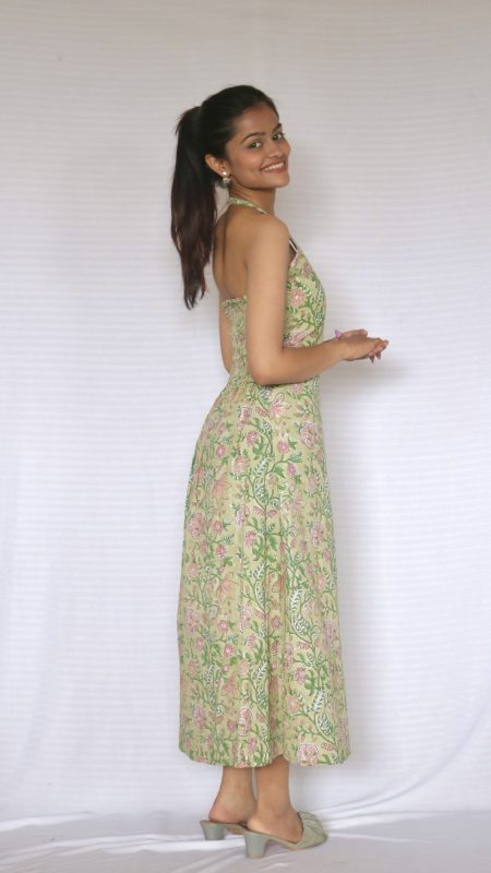 The Mishka Halter Dress in a refreshing pista green color features a chic halter neckline and a long, flowy silhouette. Designed with a smocked back for comfort and a single pocket for practicality, this dress offers both style and ease, making it perfect for casual outings or relaxed events.
