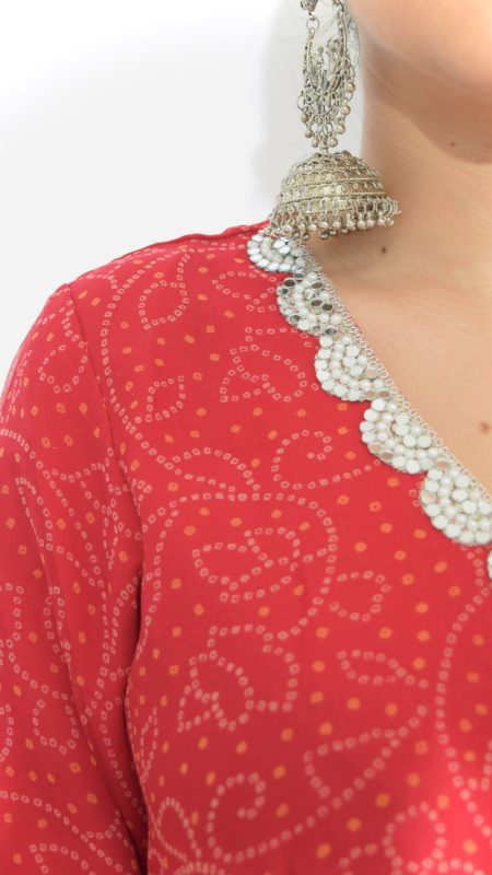 The RANI ANGRAKHA SET radiates opulence in a captivating rani pink bandhani hue. This unique two-piece ensemble boasts an exquisite antique bandhani pattern on the angrakha, adorned with intricate mirror work that catches the light with every movement. The set also includes a complementing pant, ensuring a harmonious and stylish appearance.