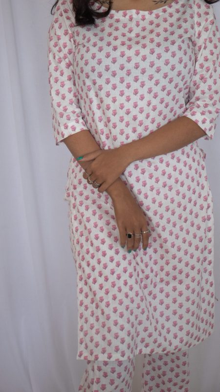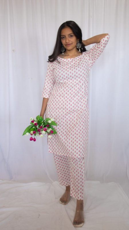 A summery outfit perfect for any occasion, this white-based pink fabric kurti with a round neck and side slits is paired with matching fabric pants for a complete look. The side slits allow for ease of movement and a comfortable fit, while the matching pants complete the look with a cohesive and chic appearance. Perfect for the summer season, this outfit is both comfortable and fashionable, making it a great choice for any casual or semi-formal event.