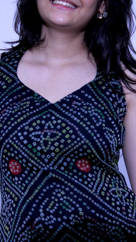 In bold black, the Zara Bandhani Kurti stands out with its heartneck-high neckline and airy chiffon fabric. Sleeveless and slit on both sides, it flows with ease and confidence.